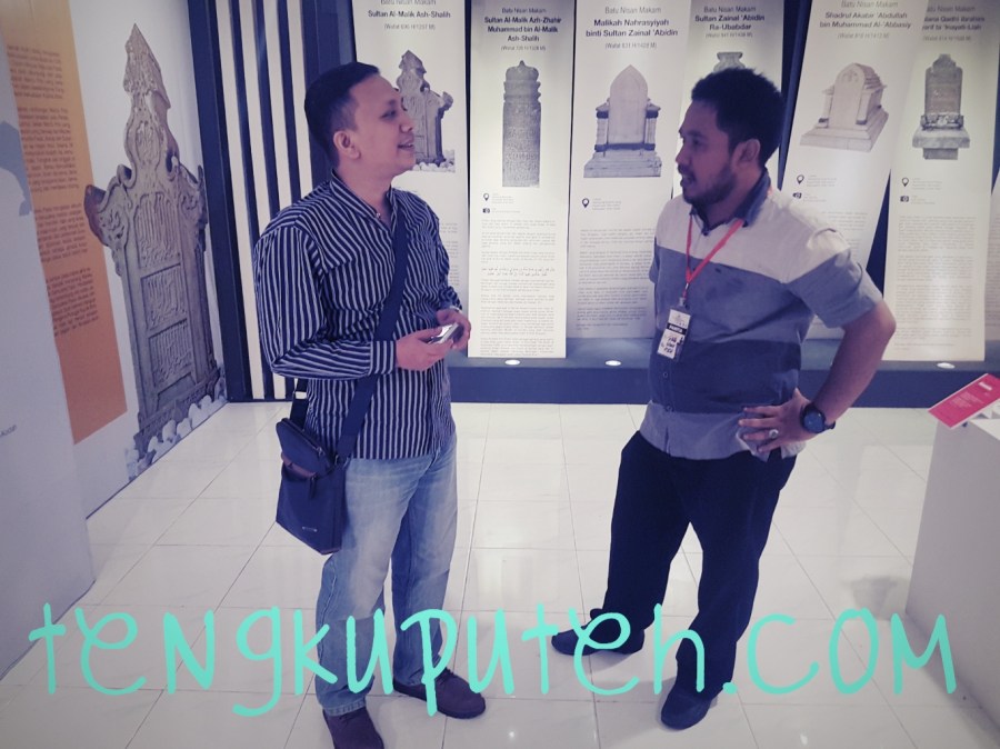 Mendengarkan penjelasan tentang sejarah batu nisan Aceh dari pemandu pameran