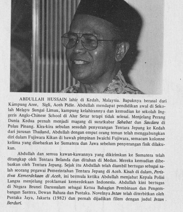 ABDULLAH HUSSAIN lahir di Kedah, Malaysia. Bapaknya berasal dari Kampung Aree, Sigli, Aceh Pidie. Abdullah mendapat pendidikan awal di Sekolah Melayu Sungai Limau, kampung kelahirannya dan kemudian ke sekolah Inggeris Anglo-Chinese School di Alur Setar tetapi tidak selesai. Menjelang Perang Dunia Kedua pernah menjadi magang di suratkabar Sahabat dan Saudara di Pulau Pinang. Kira-kira sebulan sesudah penyerangan Tentara Jepang ke Kedah dari jurusan Thailand, Abdullah dengan empat orang teman telah menggabungkan diri dalam Fujiwara Kikan di bawah pimpinan Iwaichi Fujiwara, semacam kolonne kelima yang disebarkan ke Sumatera dan Jawa sebelum penyerangan fisik dilakukan.