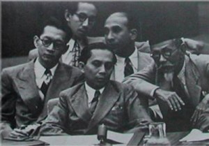 Menteri Luar Negeri Agus Salim mendampingi Perdana Menteri Indonesia Sutan Sjahrir (tengah) di Sidang PBB
