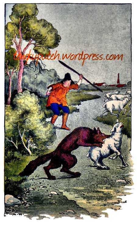 One time Mansyur and his wife went to the market, selling their crops. Mother goat is tied to a tree in front of the house. In the afternoon Mansyur returns. He heard the mother goat thrashed for his son. The goat and the wolf’s child, look no further, no matter where it goes.