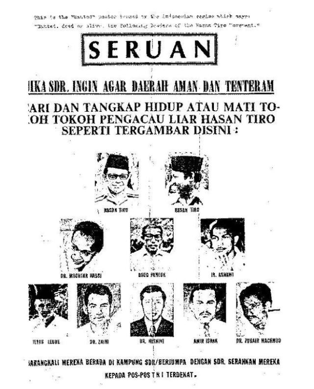 Poster pencarian orang yang berisikan tokoh GAM (Gerakan Aceh Merdeka) pada tahun 1990-an. Pemerintah Republik Indonesia awalnya diberi nama kepada mereka Gerakan Pengacau Keamanan (GPK) tahun 1989, kemudian diubah menjadi Gerakan Pengacau Liar (GPL) pada tahun 1997.