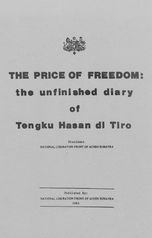 THE PRICE OF FREEDOM: The Unfinished Diary of Tengku Hasan di Tiro; Published by; National Liberation Front of Acheh Sumatra; 1984.