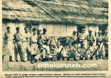 Pasukan Meriam Nukum Sanany. Foto: Meriam 18PR di tengah sebagian anggota pasukan meriam. Meriam ini tadinya sewaktu ditemukan dalam keadaan rusak, tetapi setelah diperbaiki mampu berfungsicsebagai senjata artileri yang memuntahkan ratusan peluru.