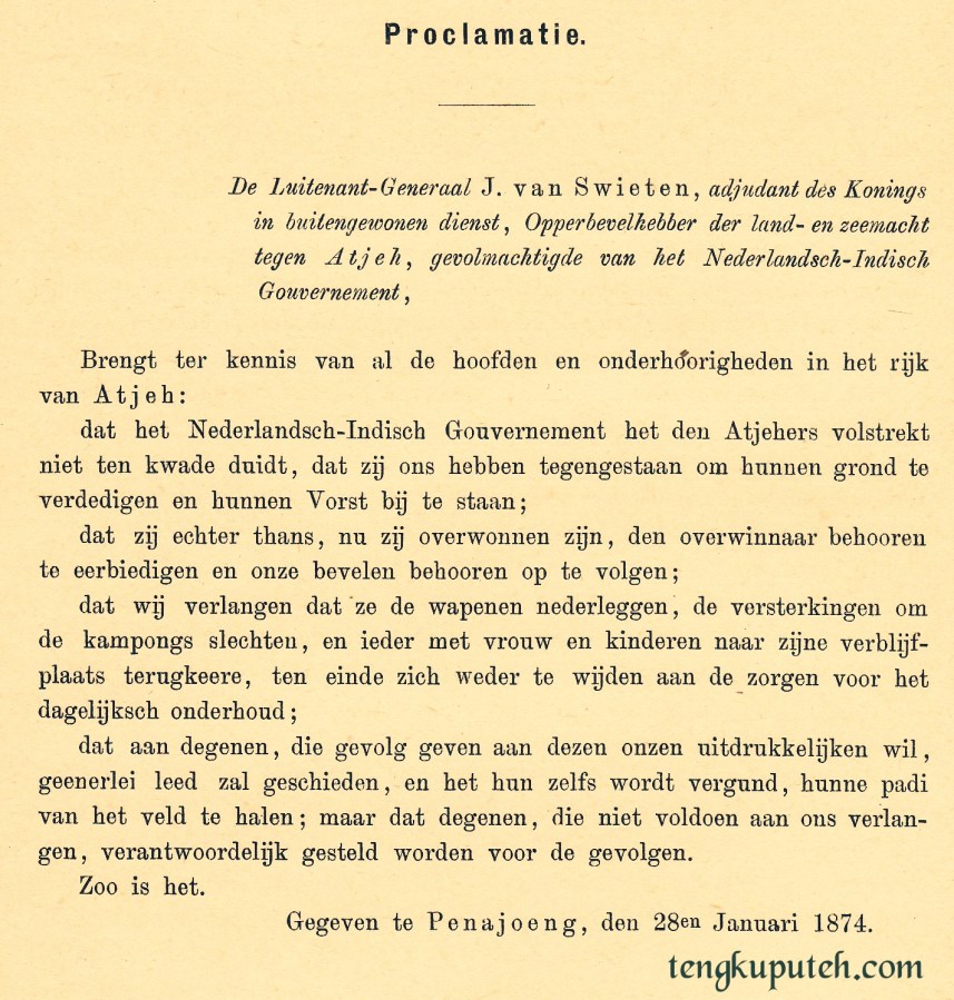 Proklamasi Kemenangan Belanda oleh Van Swieten pada 28 Januari 1874; Foto bersumber dari situs nederlandsekrijgsnacht.nl