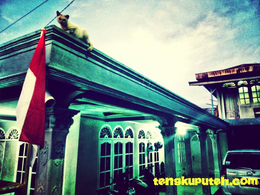 Kucing memanjat atap rumah.