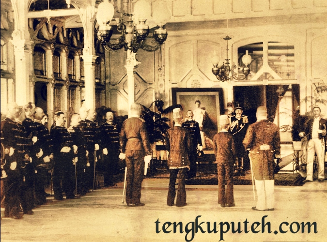 Sultan Alaiddin Muhammad Daudsyah (nomor ketiga dari kanan membelangi kamera) selaku Sultan Aceh terakhir (Masa memerintah 1873-1903) setelah ditangkap dihadapkan pada Gubernur Militer Sipil Aceh, Johannes Van Heutsz (nomor satu dari kanan menghadap kamera) menjabat 1898-1903. kelak Van Heutsz menjadi Gubernur Jenderal Hindia Belanda (Menjabat 1904-1909), foto diambil pada pendopo Gubernur Kutaradja (Banda Aceh sekarang). Untuk menghinakan Sultan Aceh dia tidak diizinkan mengenakan sepatu dan Belanda menyebutnya sebagai “Sultan pura-pura” dalam uraian foto. Sumber KITLV.
