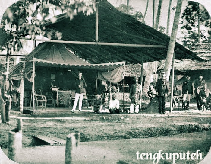 Prajurit militer pada awal perang Aceh di depan tenda perwira kedua, Aceh, 1874.